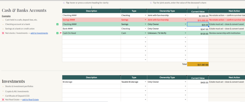 A simple spreadsheet, document system, or centralized folder can help answer foundational questions: What does the estate own? What does it owe? Which accounts are active? Which properties or belongings require attention?
